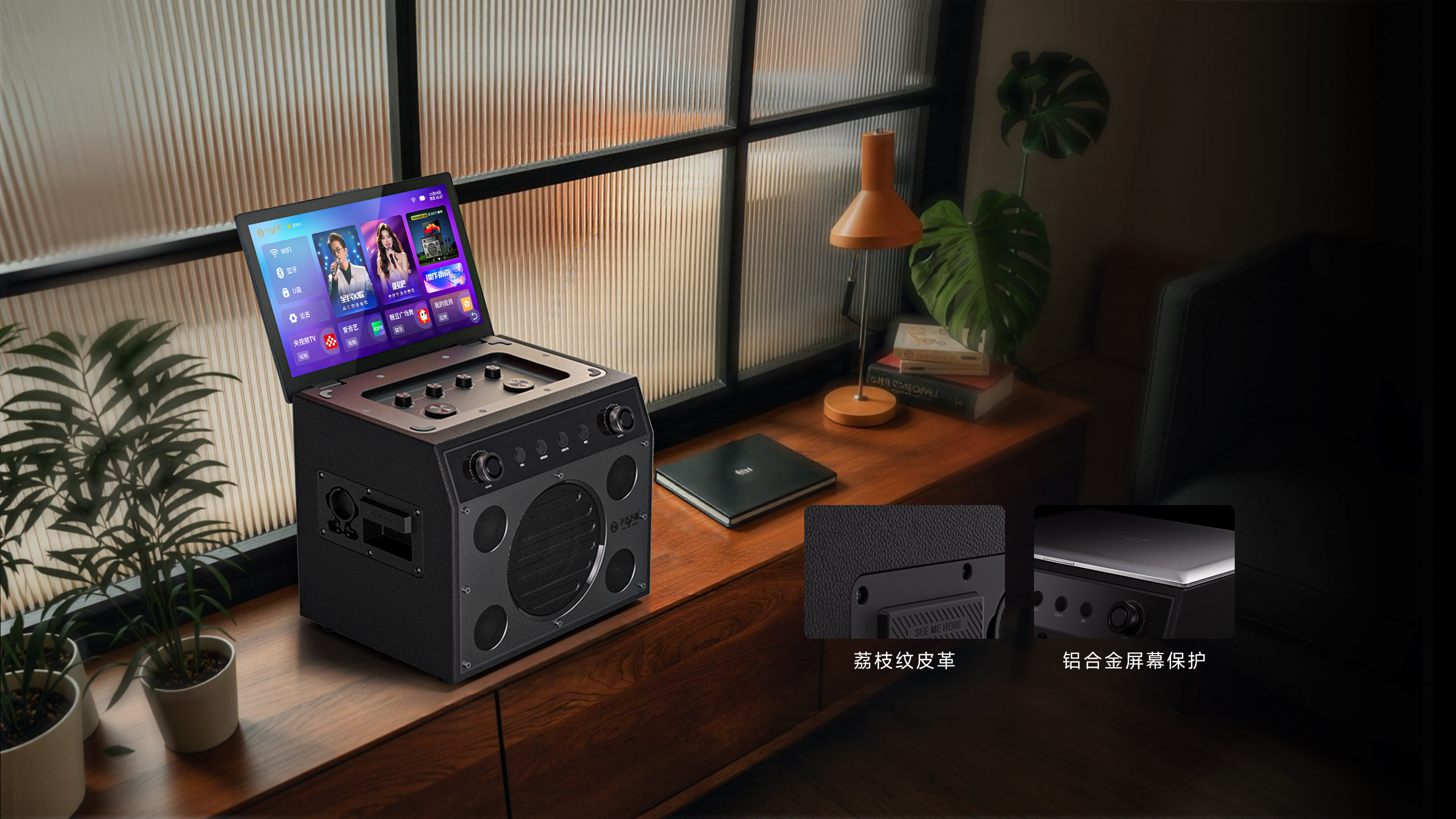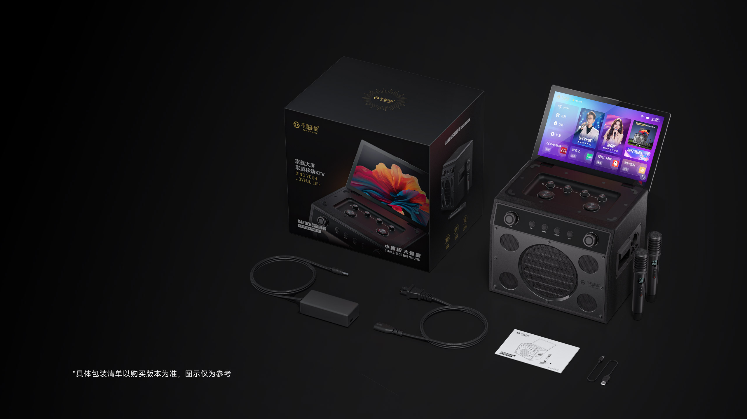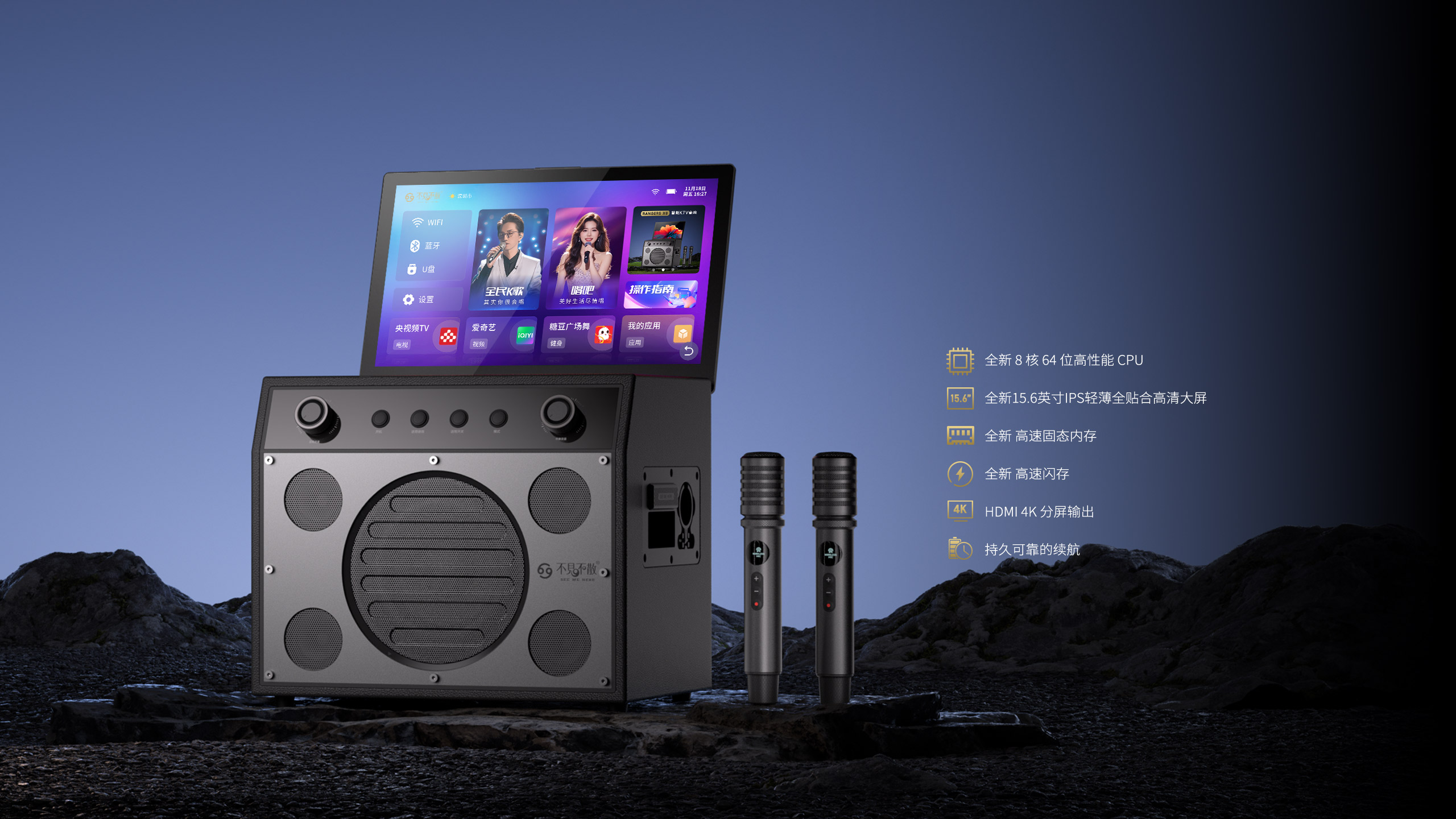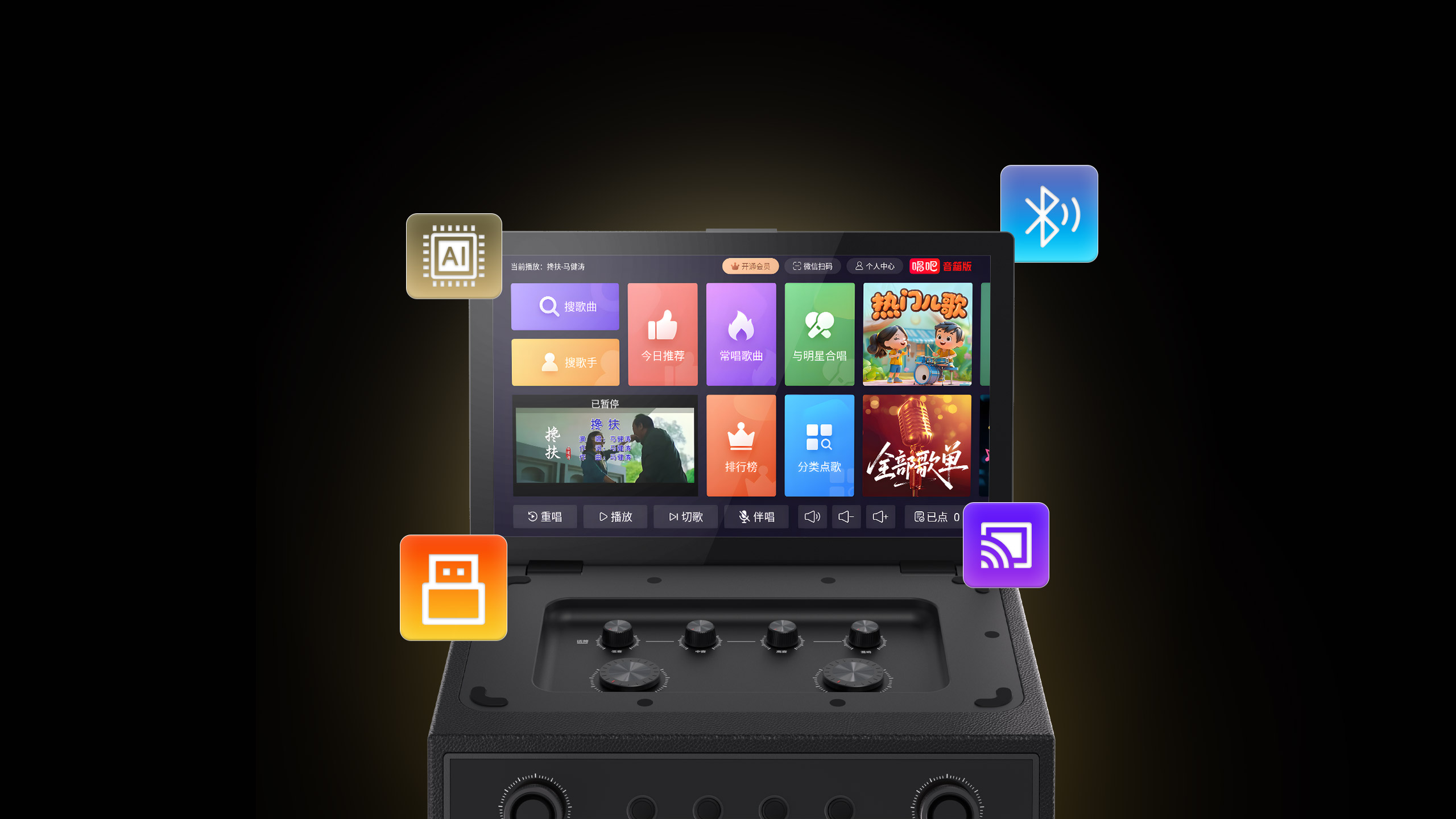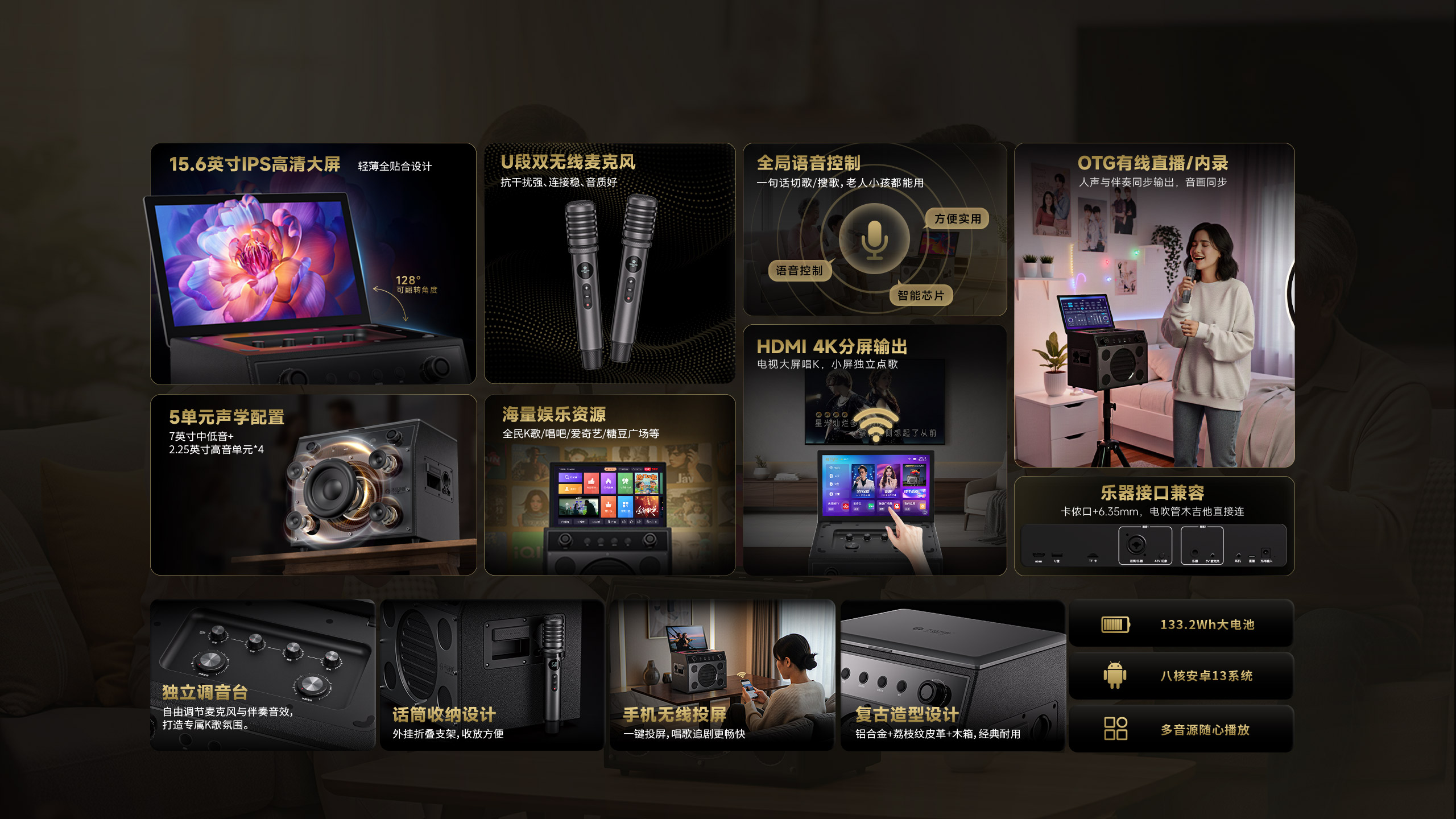 双正版K歌平台、1000万首曲库、全局AI智能语音、HDMI 4K分屏输出、 支持乐器接入、手机投屏、一体式独立调音台、OTG有线直播与内录
