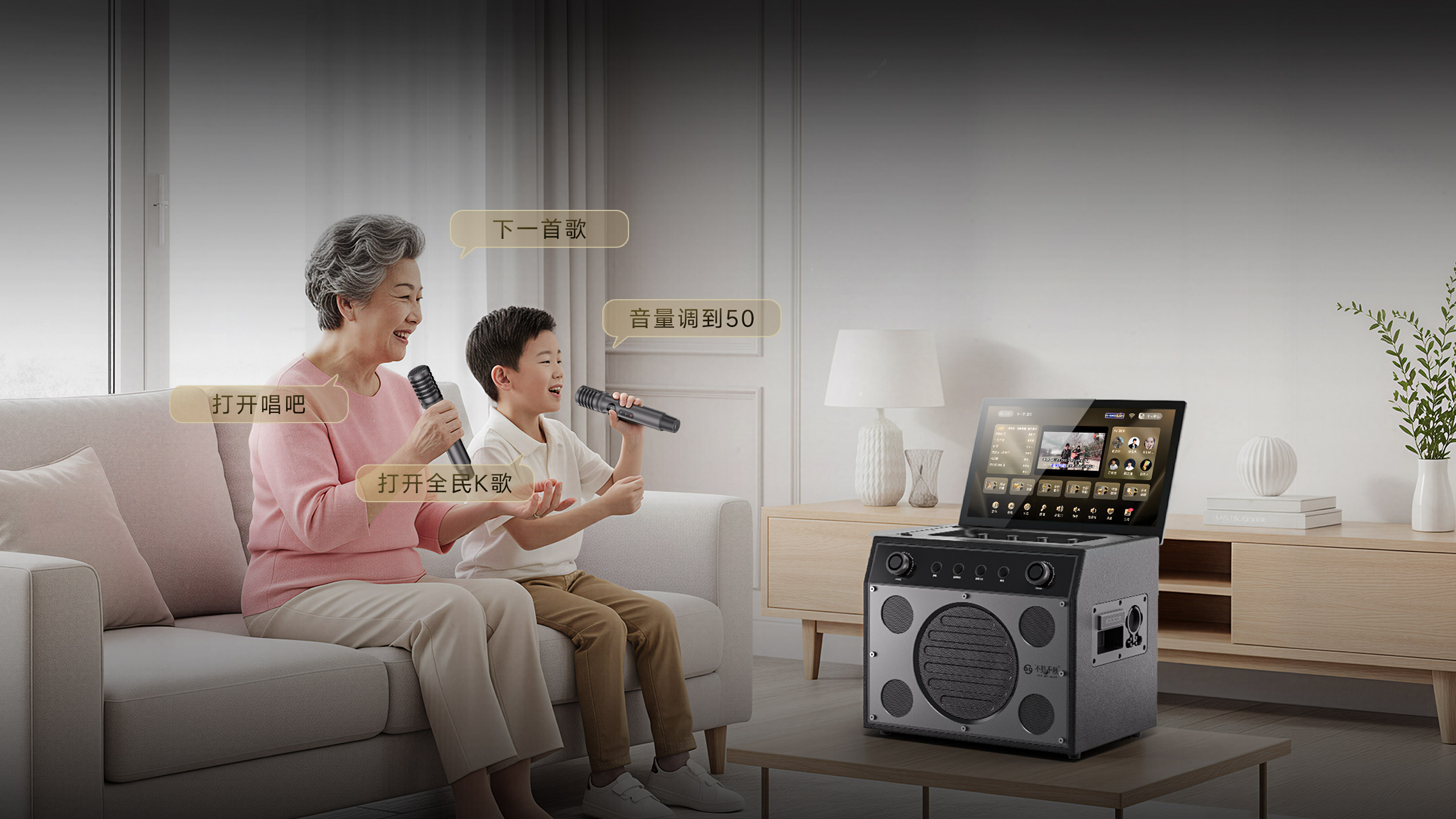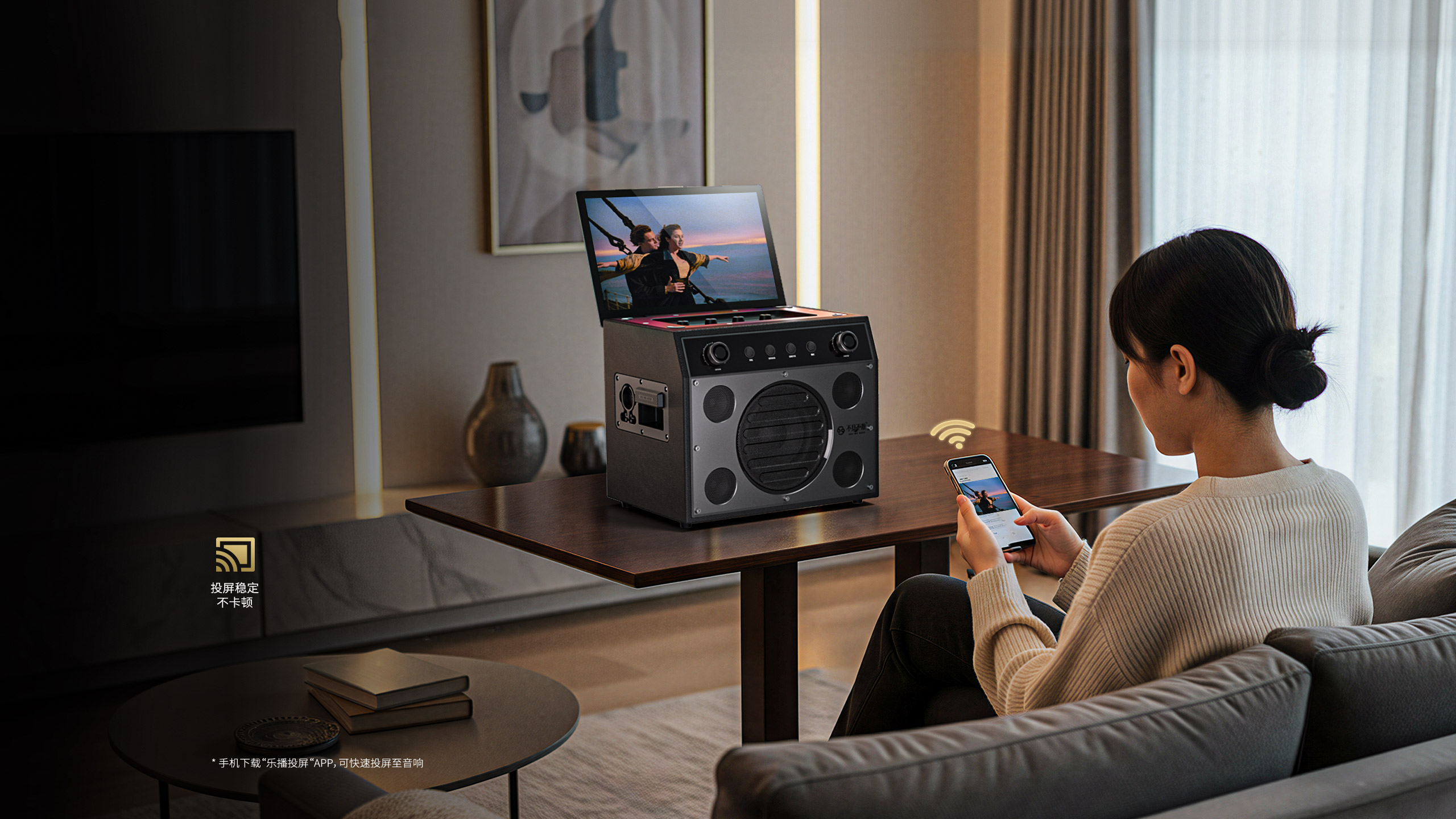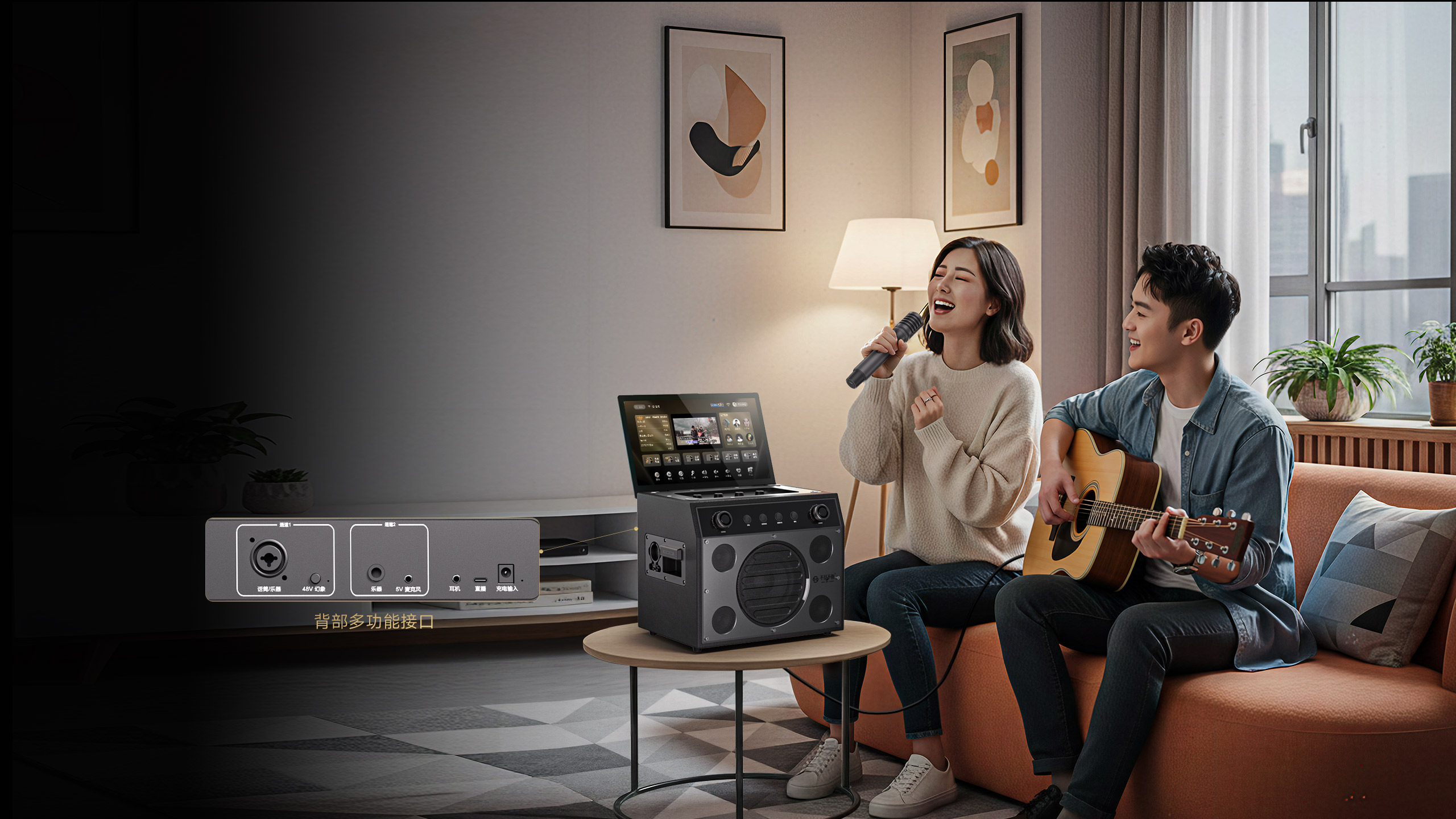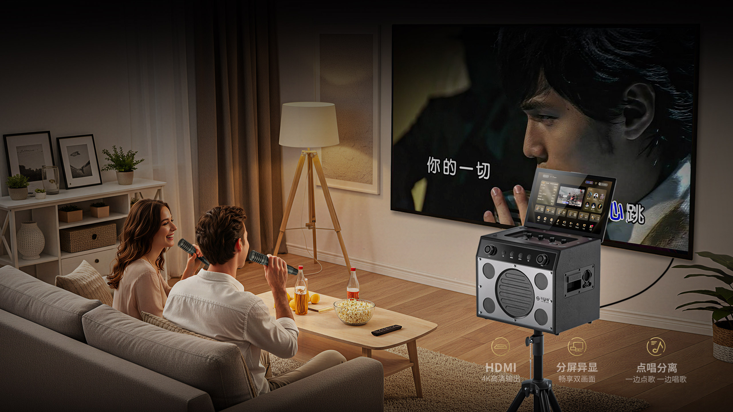 身家庭KTV。音响主屏独立点歌,外屏输出自由演